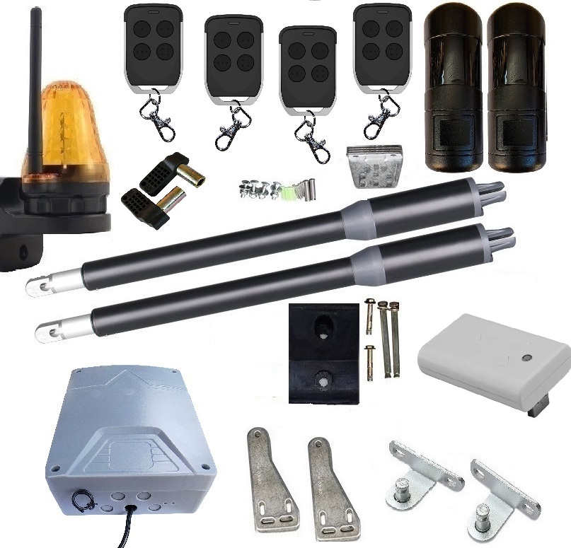 Zestaw z dwoma siłownikami, centralą 60W, czterema pilotami, fotokomórkami, lampą z anteną, mocowaniami, oraz odbojnikiem.