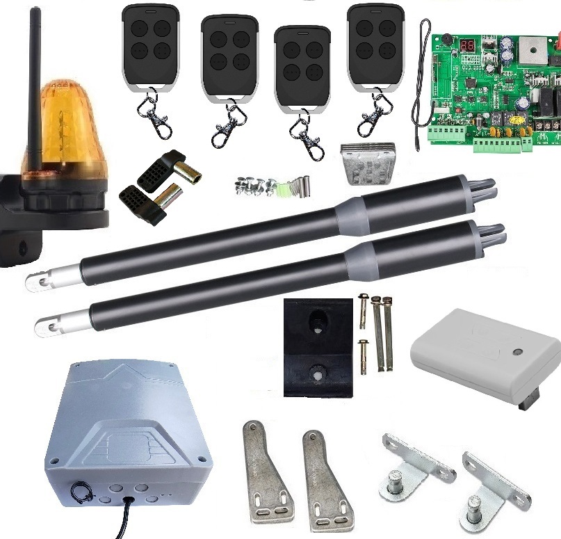 Zestaw z dwoma siłownikami, centralą 60W, czterema pilotami, STEROWANIEM WiFi SM05, lampą z anteną, mocowaniami, oraz odbojnikiem.